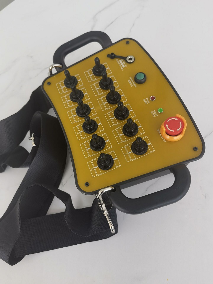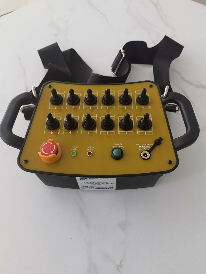 12個三位自復位撥桿(可更換為三位自鎖保持撥桿),每個撥桿均為前中后3個位置,前推或后推,松開后則自動回到中間零位,每個撥桿均可單獨控制一個電機正反轉或類似上升下降或伸縮縮回此類正反向動作12組,每個撥桿對應接收器端2路開關量,12個合計對應接收器端24路開關量信號輸出。