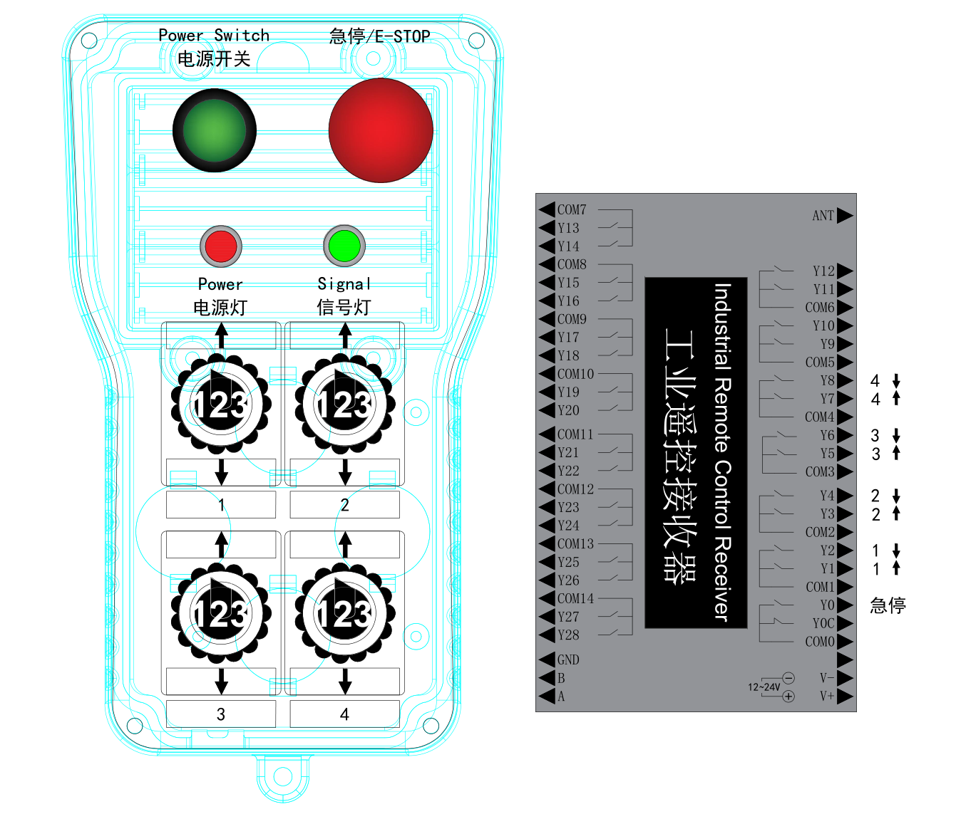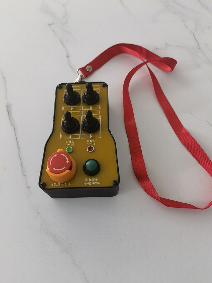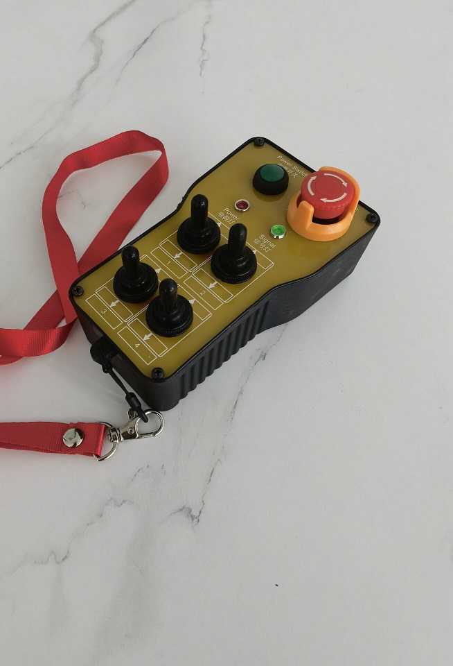 8個三位自復位撥桿(可更換為三位自鎖保持撥桿),每個撥桿均為前中后3個位置,前推或后推,松開后則自動回到中間零位,每個撥桿均可單獨控制一個電機正反轉(zhuǎn)或類似上升下降或伸縮縮回此類正反向動作8組,每個撥桿對應(yīng)接收器端2路開關(guān)量,8個合計對應(yīng)接收器端16路開關(guān)量信號輸出。 布局配置:8個三位自復位撥桿+2個指示燈+充電孔+啟動和急停蘑菇頭;